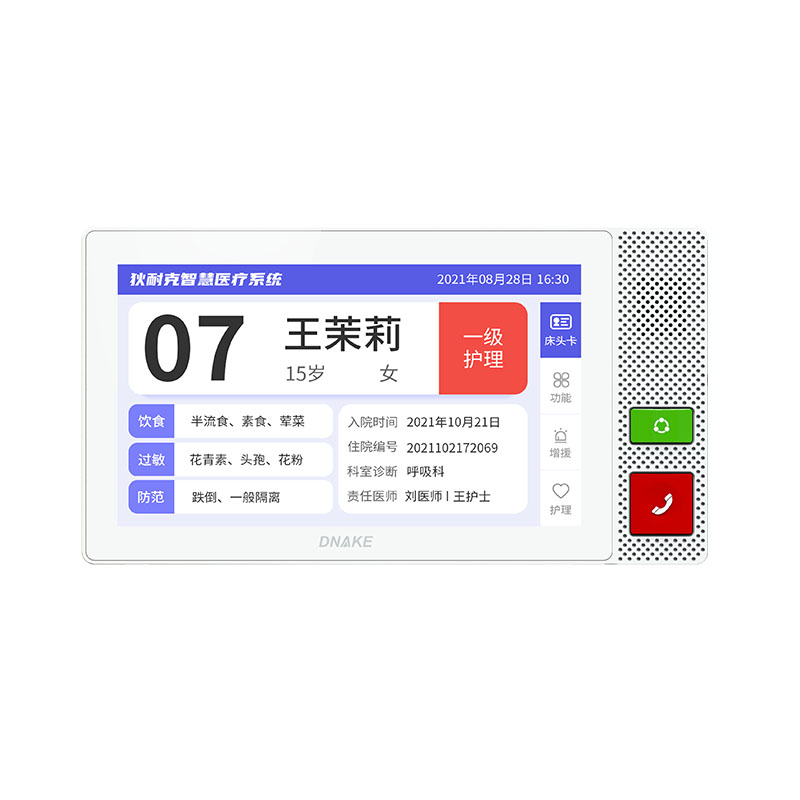 安裝在病床頭的交互設(shè)備機,代替?zhèn)鹘y(tǒng)紙質(zhì)卡。產(chǎn)品支持呼叫對講、為住院患者提供病例查詢、狀態(tài)自動提醒等護理需求等。