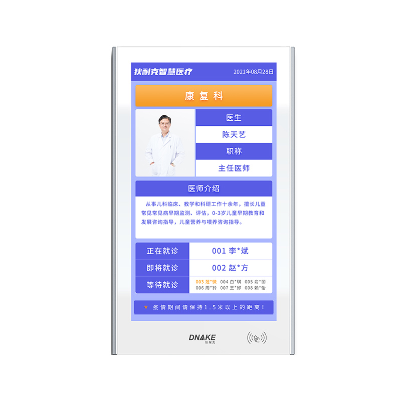 每個診室部署一臺液晶顯示終端,顯示出診專家(出診???、健康宣教等)信息,診室叫號時全屏(或分屏)顯示需就診患者信息。
