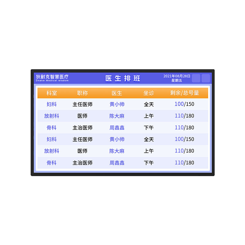 1)掛號(hào)大廳部署LED拼接電視墻,進(jìn)行屏幕劃分,分別顯示各科室目前有多少人排隊(duì),預(yù)計(jì)完成時(shí)間,掛號(hào)的多重病患的病人可以根據(jù)屏幕提示自主選擇看病次序。