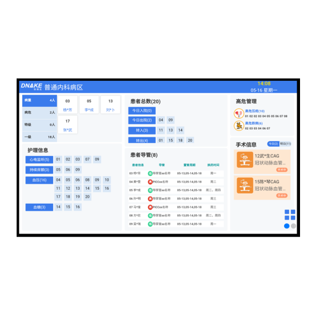 創(chuàng)新主要部署于病區(qū)護(hù)士站,用于顯示區(qū)域病房內(nèi)病床相關(guān)信息,并對報(bào)警情況做出相對顏色塊提醒,同時(shí)伴隨醫(yī)護(hù)值班情況及安排等操作??娠@示科室病房的住院人數(shù)、空閑床位數(shù)、護(hù)理等級人數(shù)、護(hù)理交接班情況、值班的醫(yī)護(hù)人員以及要事留言,完全取代傳統(tǒng)記事板。軟件參數(shù):支持顯示出入院統(tǒng)計(jì)、 根據(jù)護(hù)理等級分類查詢不同患者的床位數(shù)和總?cè)藬?shù)、支持護(hù)理信息查詢不同床位、支持患者導(dǎo)管信息查詢