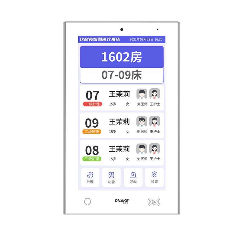 設(shè)置在病房門口的終端設(shè)備,主要用于顯示病房相關(guān)信息,內(nèi)置簡(jiǎn)易醫(yī)護(hù)工作站,支持病房床位一覽、患者動(dòng)態(tài)跟蹤、呼叫對(duì)講、增援求救等多種呼叫類型,信息齊全,及時(shí)響應(yīng)醫(yī)護(hù)需求,實(shí)現(xiàn)智能化醫(yī)護(hù)管理。