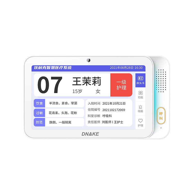 安裝在病床頭的交互設(shè)備機,代替?zhèn)鹘y(tǒng)紙質(zhì)卡。產(chǎn)品支持呼叫對講、為住院患者提供病例查詢、狀態(tài)自動提醒等護(hù)理需求等。